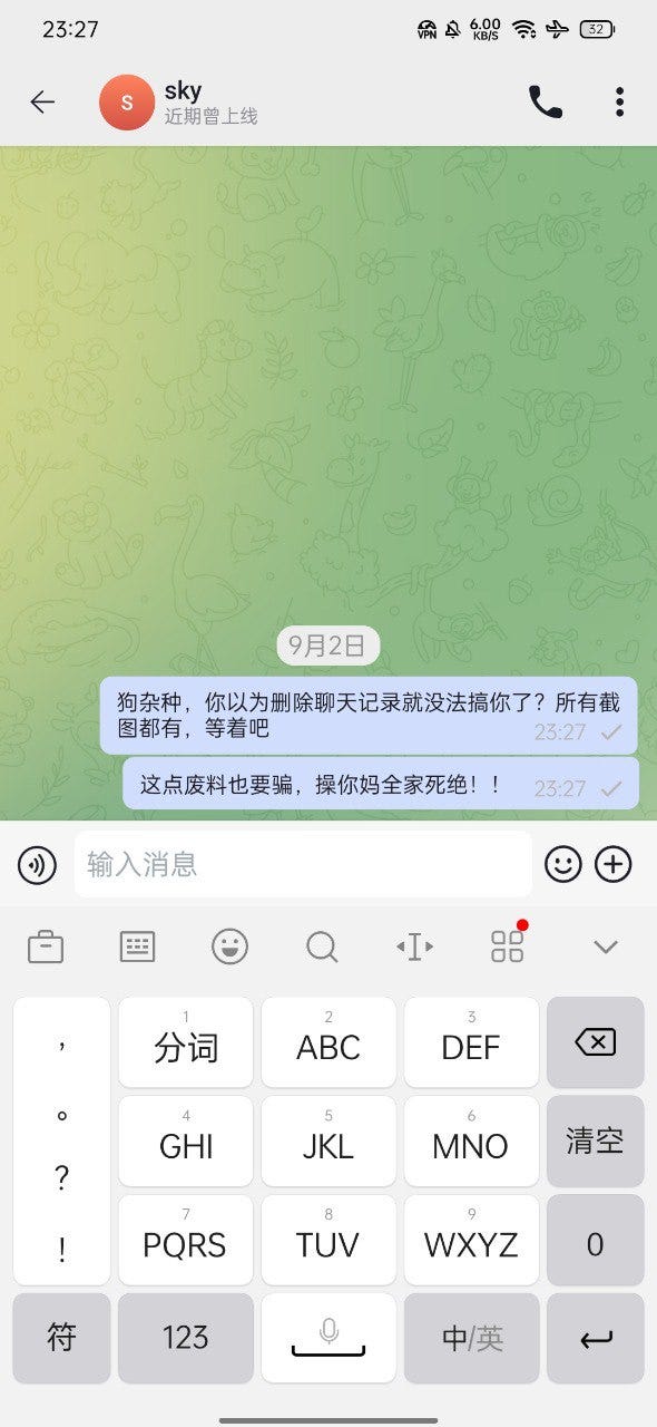 This bastard advertised in the group that he was buying Japanese JP scraps. The agreed price was 500 yuan for 10,000 pieces. He gave me various reasons not to provide a guarantee. I believed him and sent him the materials. He ran away in less than 2 minutes after I downloaded the materials in the folder. This damn liar's entire family must be killed!!! Son of a bitch!!!
